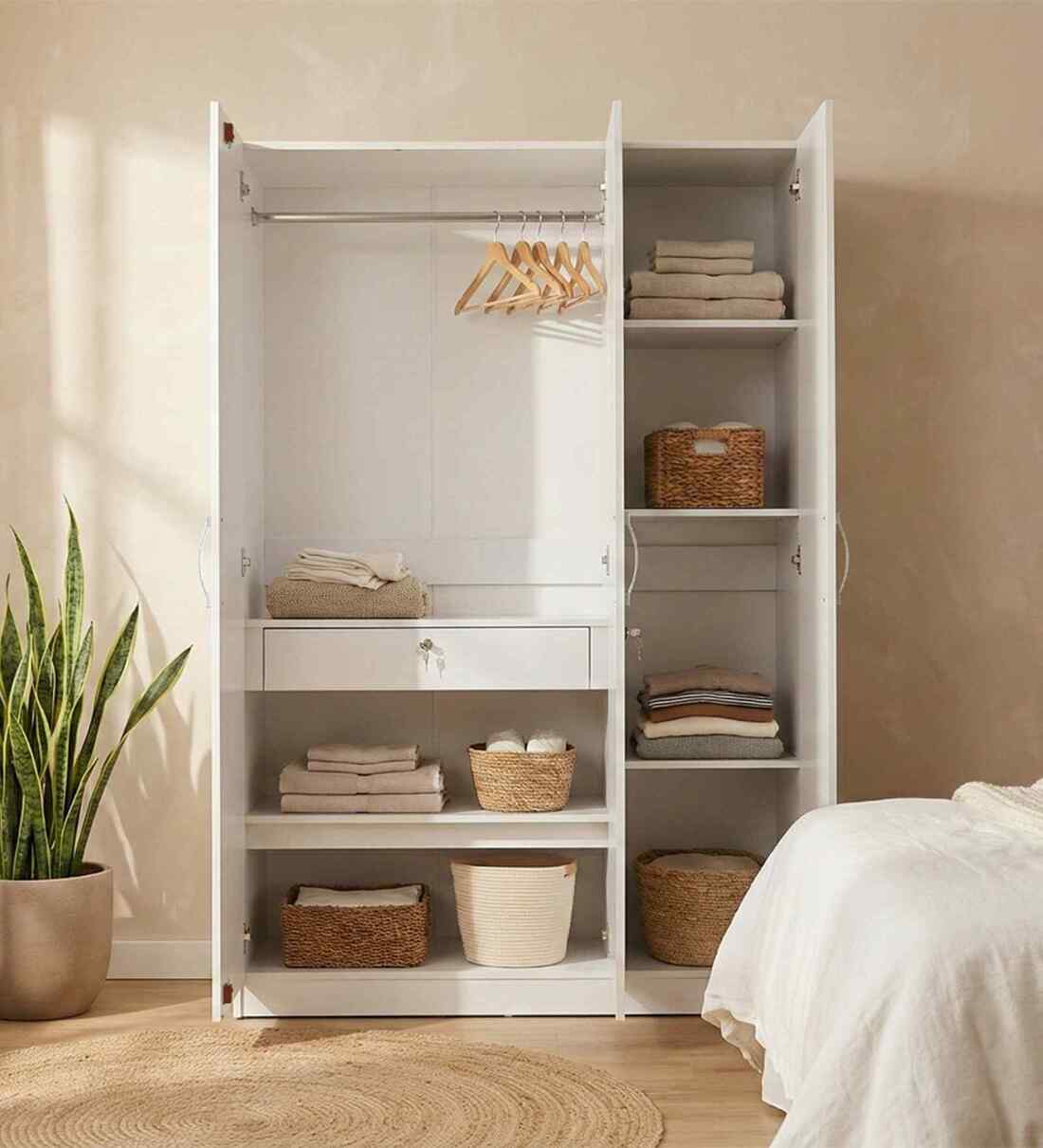 Upgrade your bedroom storage with the Willy 3 Door Wardrobe, designed to offer a perfect blend of style, functionality, and durability. Finished in an elegant white color, this wardrobe complements all types of home d cor, from modern to classic interiors. The wardrobe features a spacious hanging section with a sturdy metal rod, ideal for storing shirts, kurtas, dresses, and coats without creasing. Multiple open shelves provide ample space to neatly organize folded clothes, accessories, bags, and linens. A lockable drawer/locker ensures safe and secure storage of valuables, documents, and personal belongings. Built with smooth hinged shutters and strong handles, the Willy wardrobe offers effortless access and long-lasting performance. Its compact and space-saving design makes it an excellent choice for small bedrooms, studio apartments, or guest rooms. Stylish, practical, and efficient, the Willy 3 Door Wardrobe is a smart storage solution that keeps your space organized while enhancing the overall look of your room.