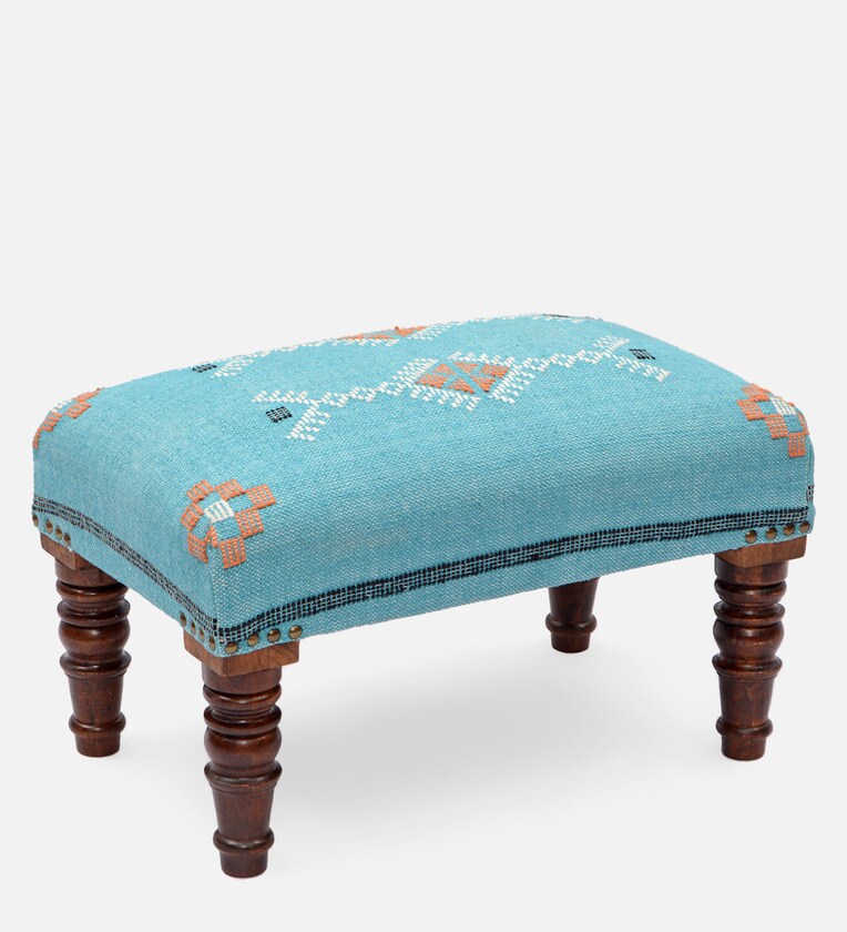 An Eye Catching Look Handcrafted Rug Upholstered Wooden Stool for Your Living Room, Bedroom Furntiure. This Wooden Stool Made by High Quality Wood With Handmade Rug Fabric; Which Developed By Our Local Artisans.