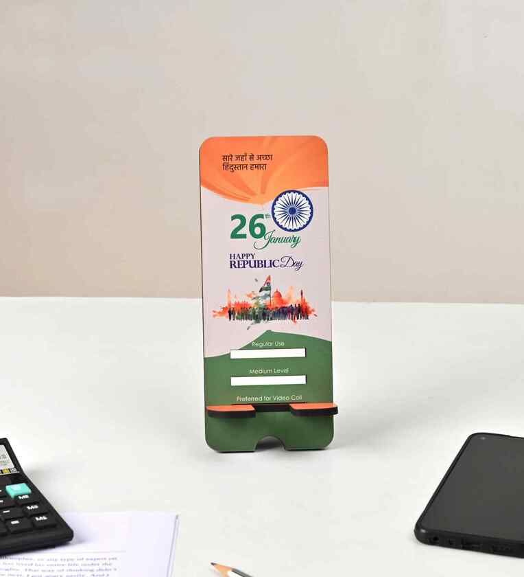 Celebrate Republic Day with this stunning wooden mobile stand, featuring a unique Republic Day theme with intricate engravings of national symbols and heartfelt wishes. Crafted from premium, eco-friendly wood, this mobile stand is not only durable but also environmentally conscious, offering a stylish and sustainable way to hold your mobile device. This Republic Day gift is ideal for gifting to family, friends, or colleagues who cherish India s national pride. The mobile stand is perfect for watching videos, attending video calls, or browsing, making it both functional and decorative. Designed to bring a sense of patriotism into your home or office, this wooden mobile holder makes a thoughtful gift for Republic Day, celebrating the rich history and culture of India.