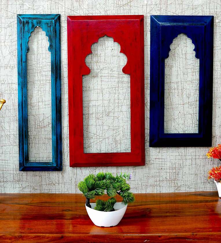 Wooden (Set Of 3) Carved Jharokha In Blue Colour