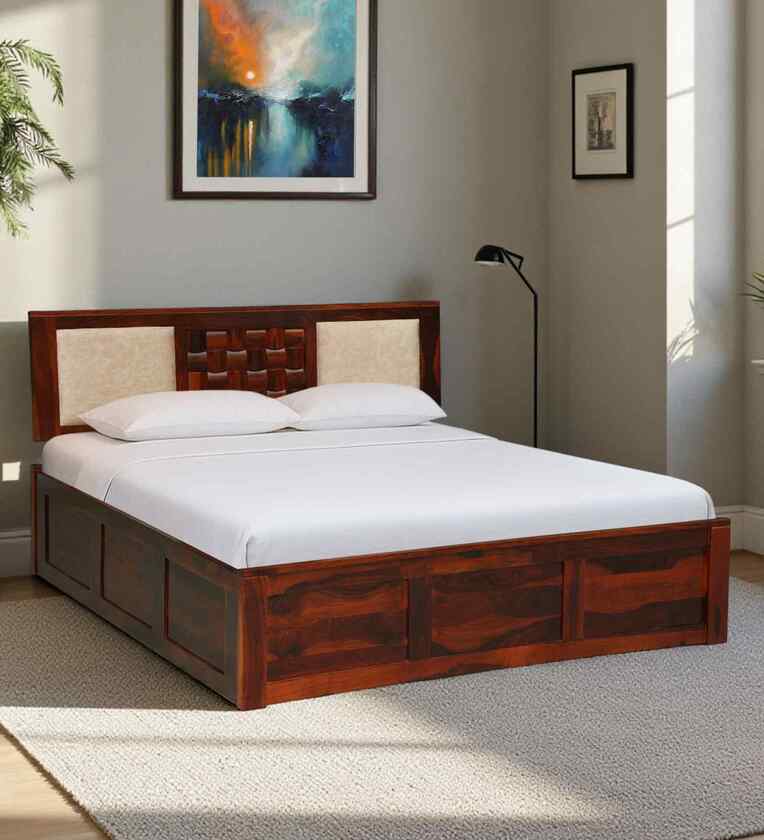 Woodway Sheesham Wood Queen Size Bed In Honey Oak Finish With Hydraulic Storage