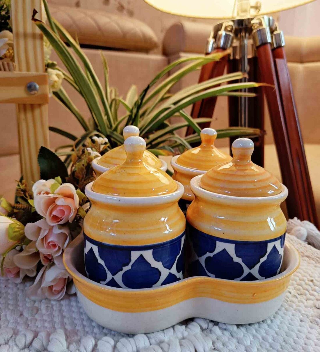 Niyara Multipurpose Storage Ceramic Pickle set Jars with Lid & tray (Set of 4, 300 ml) (Yellow)