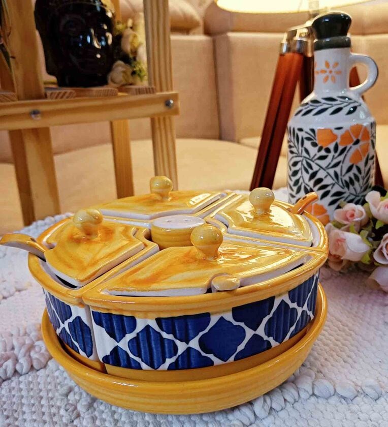 Niyara Multipurpose Storage Ceramic Pickle Set Jars & with Lid & Tray & Spoon & Salt Dispenser (Set of 5, 300 ML) (Yellow)