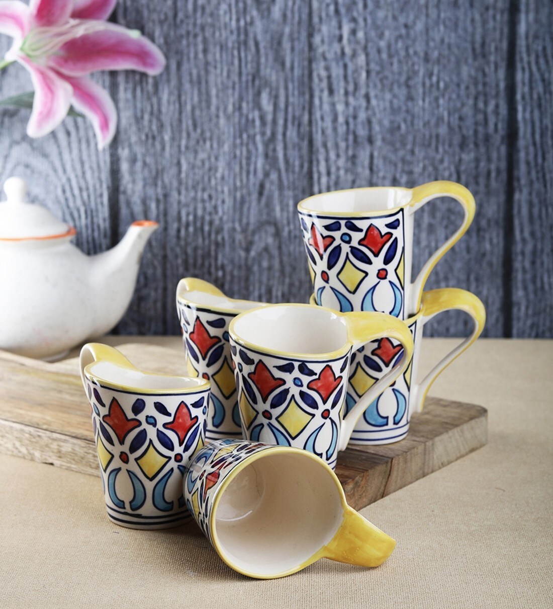 VarEesha dedicates this beautiful ceramic collection of Rangriti to the famous Mandala art form practised in various parts of India and Tibet. This revolves in designs around a mandala, literally menaing a circle, reflecting the entire universe. The patterns and symbols have vibrant colors that compliment each other beautifully. These are so attractive to look at that you would want to just decorate with them and many times not even want to distort them with food. Each piece goes through the long process of clay baking, drawing, painting, re-baking and glazing. Every piece is also uniquely made and painted by hand and thus may differ slightly from each other in size, color and shape. These Yellow Red Ceramic Tea/Coffee Mugs Set from Rangriti collection has six cups with a capacity of 150 ml each. These are lead free and microwave safe. A one stop-shop for home decor and furniture, Pepperfry sells a home product every 30 seconds.