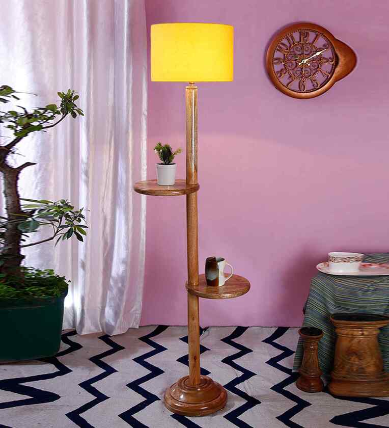 Yellow Cotton Drum Wooden Floor Lamp
