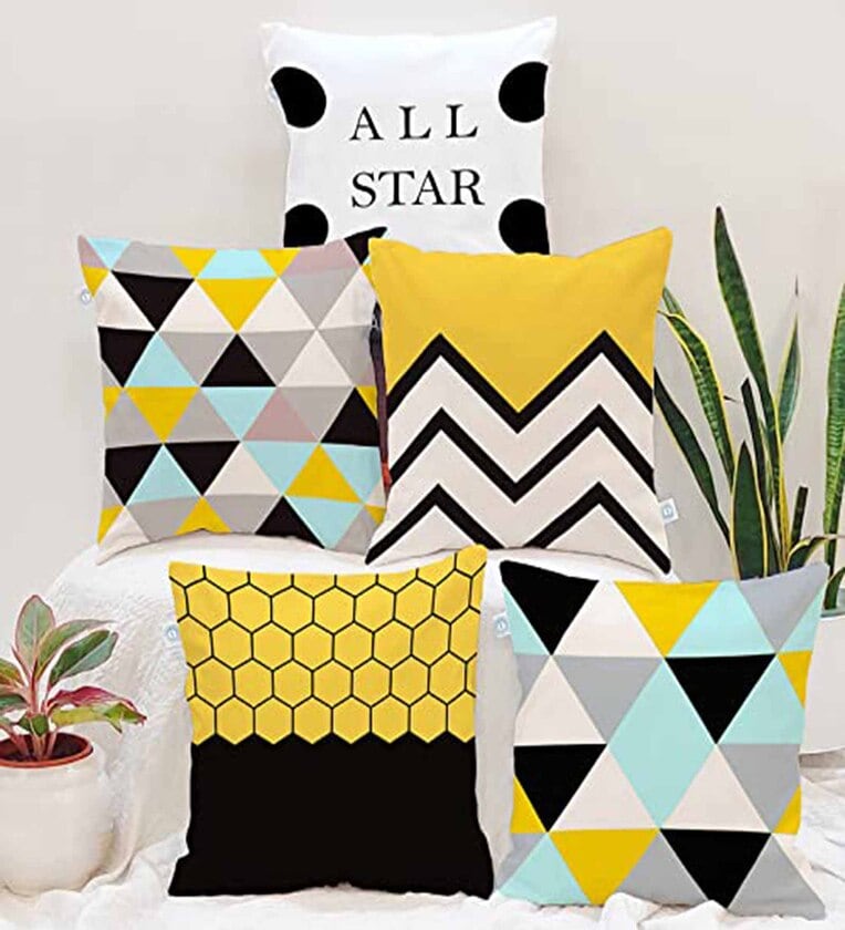Yellow Cotton Geometric 16x16 inches Cushion Covers (Pack of 5)