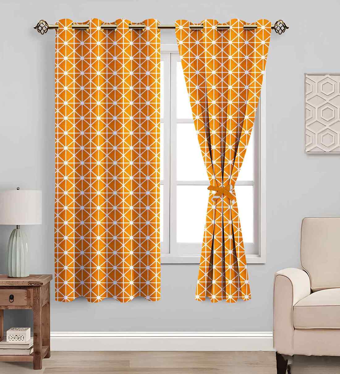 Yellow Cotton Geometric 5ft Semisheer Eyelet Window Curtain (2 Pc)