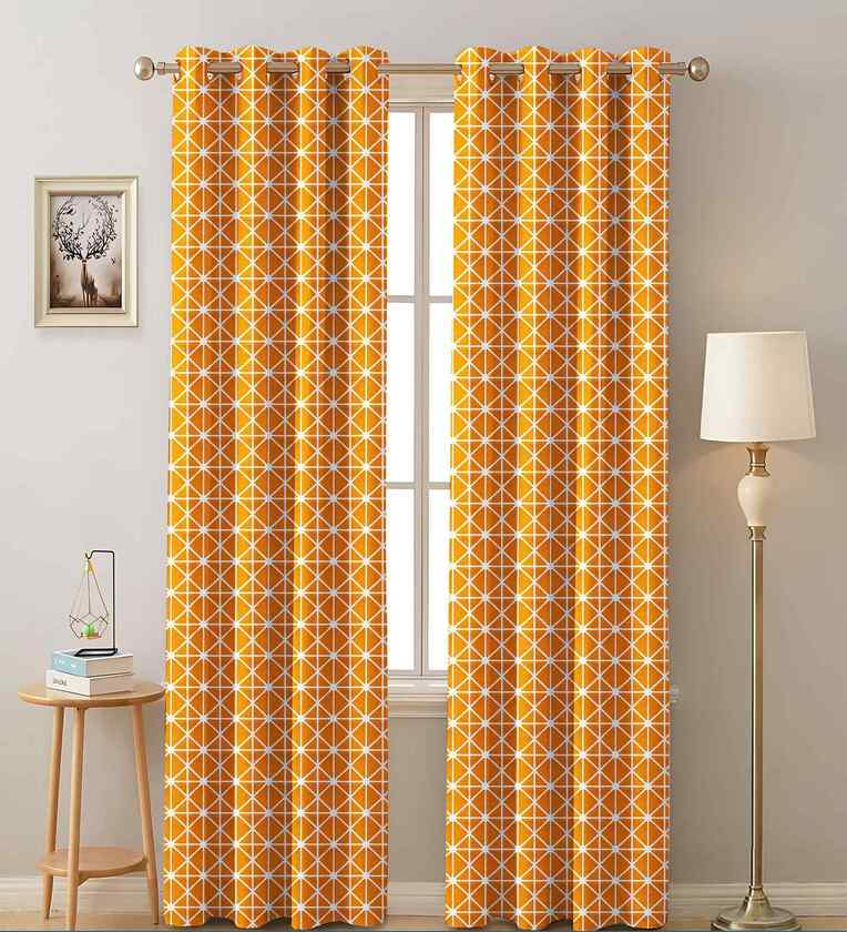 Yellow Cotton Geometric 7ft Semisheer Eyelet Door Curtain (2 Pc)