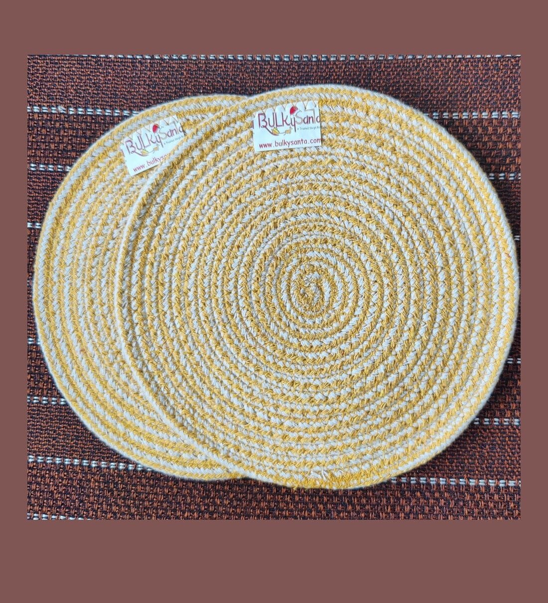 Pack of 2 placemats. Scratch and noise resistant. Reversible Use and machine washable. Useful for hot pans, pots for general decoration like wall d cor. Non-slippery, heat-insulating, colour-fast, odourless, environment friendly. Material Made of high-quality cotton. Shape: Round, Size: 23 cm. Great for daily use or special occasions. These beautiful bulkysanta's placemats or placement mats are eco-friendly and curated with love by our local artisans.