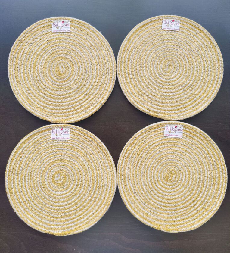 Pack of 4 placemats. Scratch and noise resistant. Reversible Use and machine washable. Useful for hot pans, pots for general decoration like wall d cor. Non-slippery, heat-insulating, colour-fast, odourless, environment friendly. Material Made of high-quality cotton. Shape: Round, Size: 23 cm. Great for daily use or special occasions. These beautiful bulkysanta's placemats or placement mats are eco-friendly and curated with love by our local artisans.