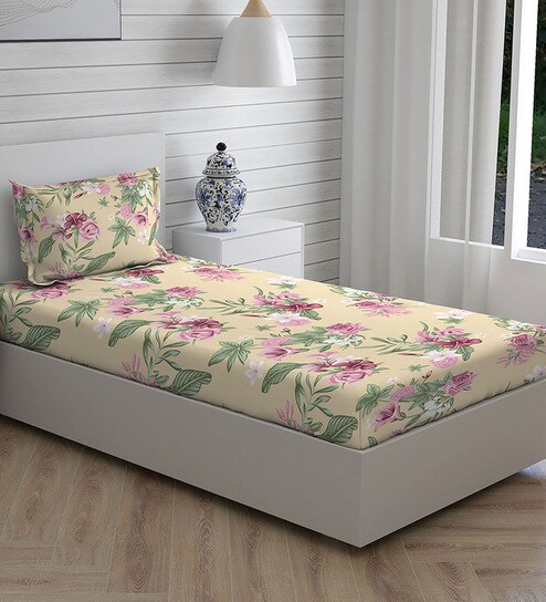 Yellow Floral 104 TC Cotton Single Bed Sized Bed Sheets With 1 Pillow Cover