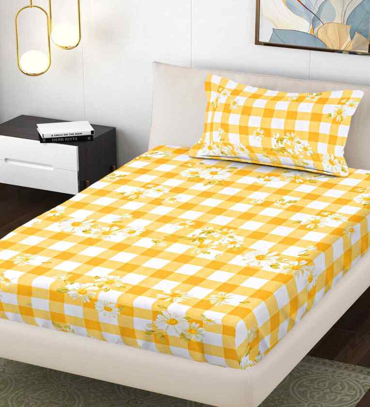Yellow Geometric 300 TC Cotton Blend Single Bedsheet with 1 Pillow Cover