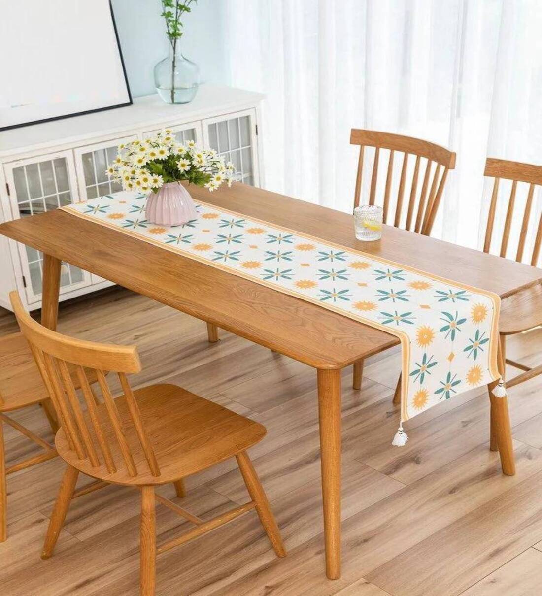 Yellow & Green Floral Woven Cotton Table Runner with Tassels