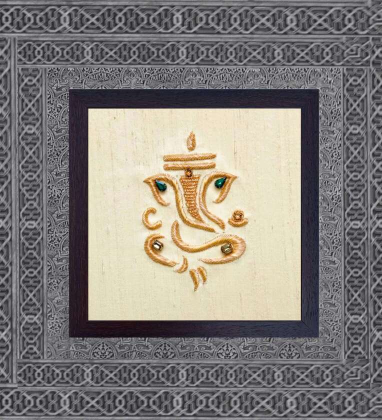 Yellow Handcrafted Lord Ganpathi Gold-Plated Jardoshi Embroidery Wall Art