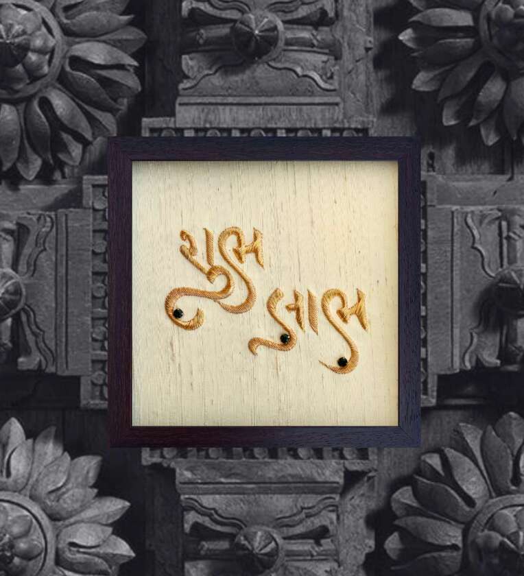 Yellow Handcrafted Shubh-Labh Gold-Plated Jardoshi Embroidery Wall Art