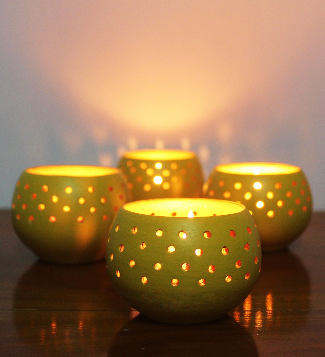 An ethnic handcrafted Gift to assure the purest form of delight with the pleasure of Natural Light. The best indoor light with natural play of lights in the form of modern design. Pack of 4 terracotta pots with perfumed smokeless tea light candles. Handmade by trained Potters and Artisans of West Bengal, INDIA.