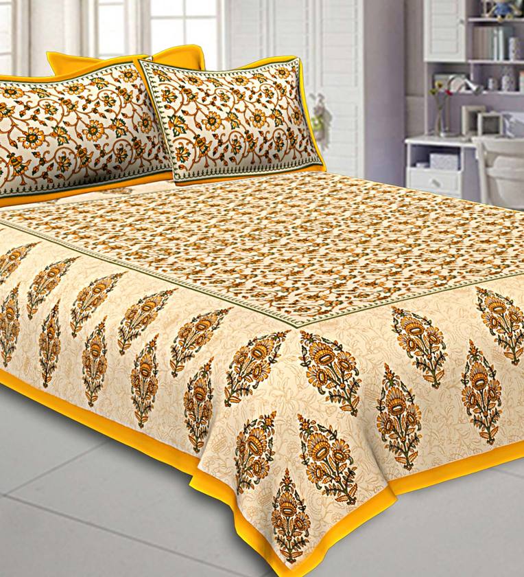 Yellow Traditional 200 TC Cotton 1 Double King Size Bedsheet with 2 Pillow Covers