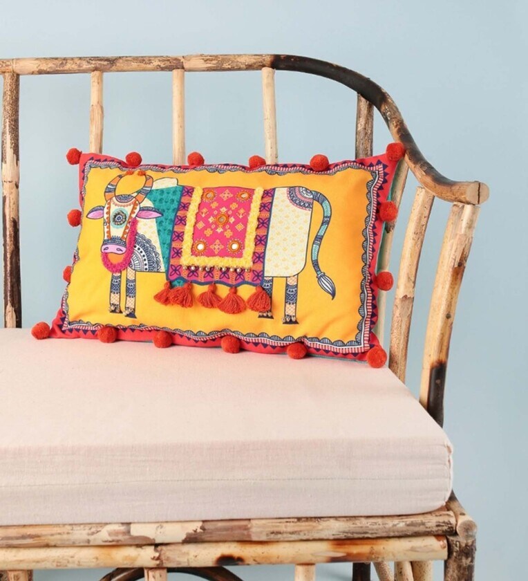 Add comfort to your relaxing time while making your space look pretty with the Ornate Cow Cushion Cover. This cushion is made from cotton & polyester. It also has Pom Pom to the edges & design has tassel, mirrors, beads & Bells on it.