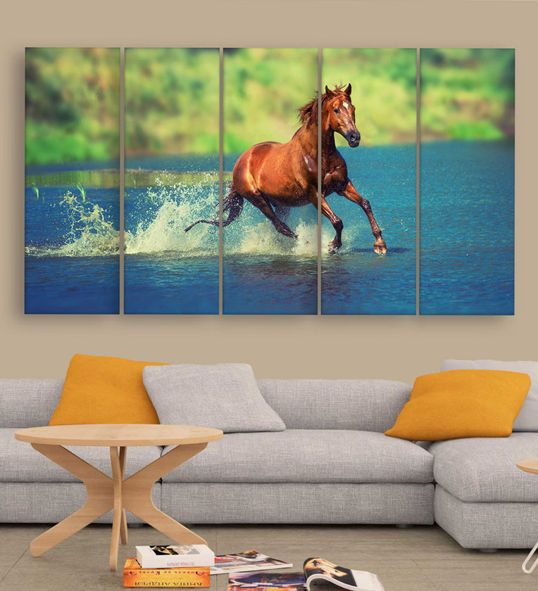 Yellow Wood Multiple Frames Beautiful Running Horses Vastu Art Panels