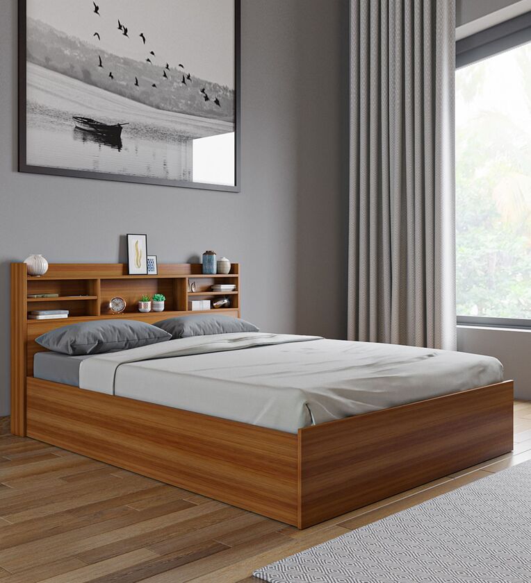 A contemporary wooden bed designed for both style and functionality, featuring a warm wood-finish frame with clean, straight lines. The integrated headboard includes open shelves, perfect for keeping books, d cor, or everyday essentials within easy reach. Paired with soft neutral bedding and set against calming grey walls, the bed creates a cozy and organized sleeping space. Natural light from the large window enhances the rich wood tones, making this bed an ideal choice for modern homes that value comfort, practicality, and timeless design.