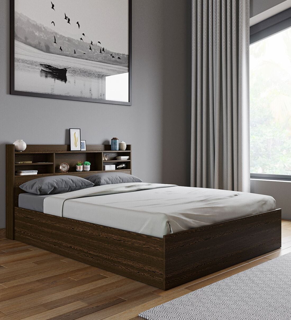 A contemporary wooden bed designed for both style and functionality, featuring a warm wood-finish frame with clean, straight lines. The integrated headboard includes open shelves, perfect for keeping books, d cor, or everyday essentials within easy reach. Paired with soft neutral bedding and set against calming grey walls, the bed creates a cozy and organized sleeping space. Natural light from the large window enhances the rich wood tones, making this bed an ideal choice for modern homes that value comfort, practicality, and timeless design.