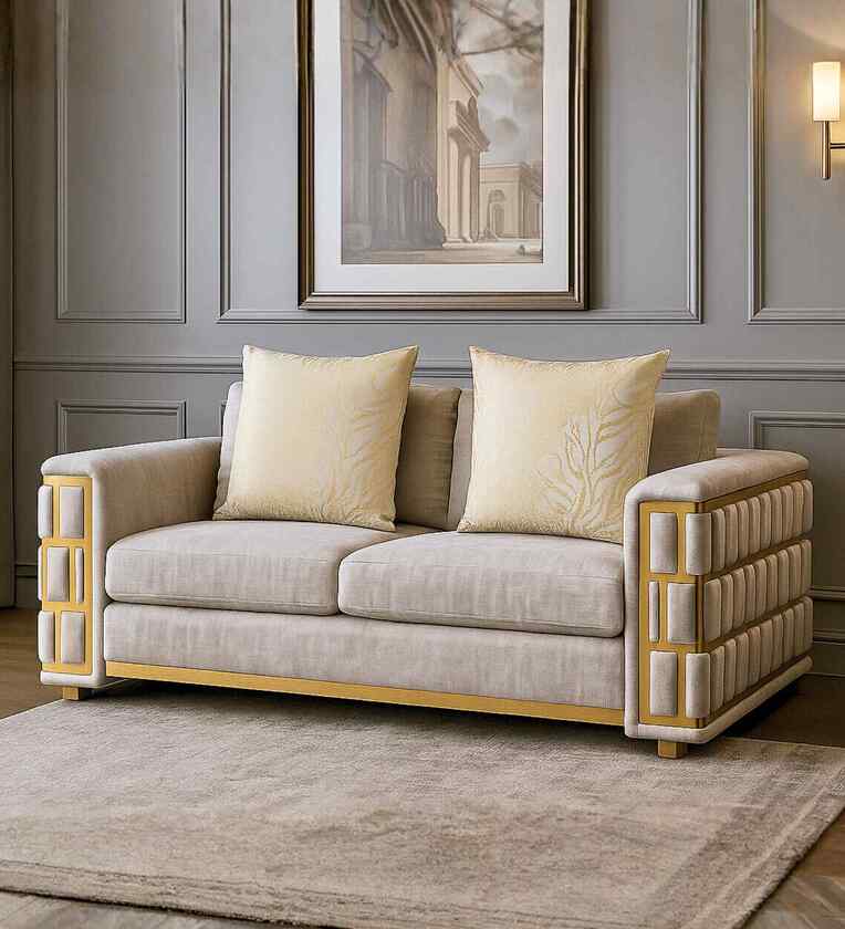 Enhance your living space with the Royaloak Zurich Italian Fabric Sofa 2 Seater, a stylish 2 Seater Sofa for Living Room designed for luxury and comfort. Upholstered in premium fabric, it features plush seat and back cushions with pocket springs for superior support. The armrests and sides showcase a geometric panel pattern with soft cushioned blocks framed in a gold-finished border, complemented by a decorative gold-plated stainless steel frame and golden trim at the base. Complete with two cream-and-gold throw pillows, this 2 Seater Sofa combines elegance with functionality, making it an ideal Sofa 2 Seater for Living Room or sofa 2 seater for contemporary interiors.